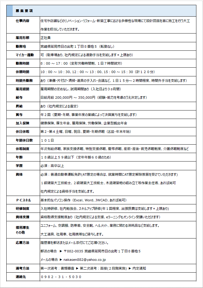15年という節目を迎え、さらなる成長に向けて新たに “大工スタッフ” を募集します。経験者の方はもちろん、未経験でも「建築に興味がある」「ものづくりが好き」「資格取得を目指したい」そんな想いをお持ちの方を歓迎します。挑戦する気持ちを全力で応援します!!!