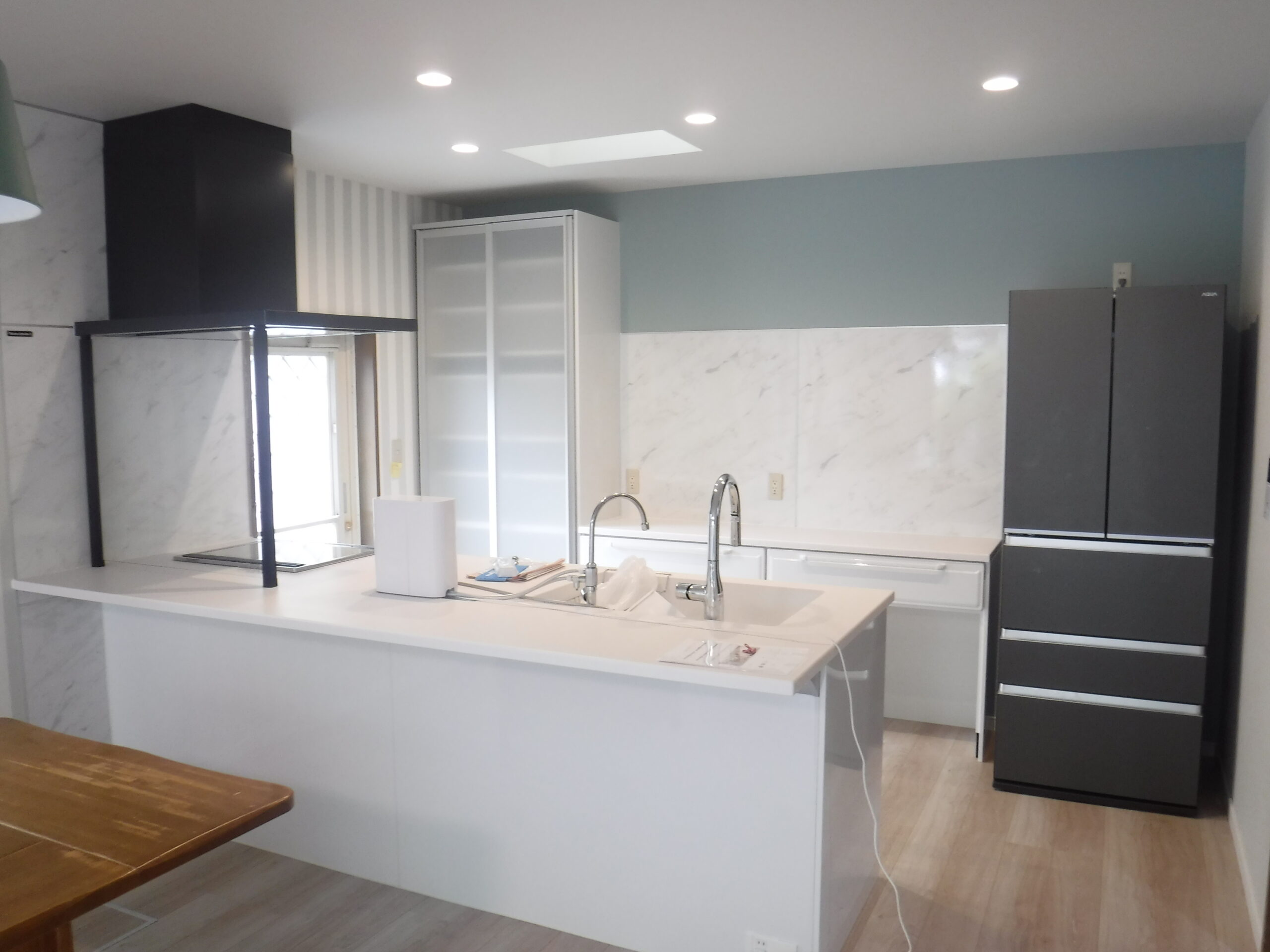キッチンが古く、奥様が長年夢見ていたキッチンの改修実施しました。キッチンとダイニングリビングが壁により少し区切られていましたが、壁をなくし一体感のあるLDKへと改修しました。